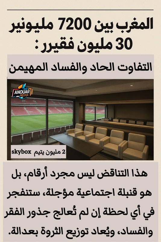 حين نقرأ أن المغرب يضم 7200 مليونير من أصل نحو 40 مليون نسمة، يتبقى أكثر من 30 مليون مغربي فقير يرزحون تحت وطأة الغلاء وصعوبة المعيشة. هذا ليس مجرد واقع اقتصادي، بل هو خنادق اجتماعي مترامية الأطراف.